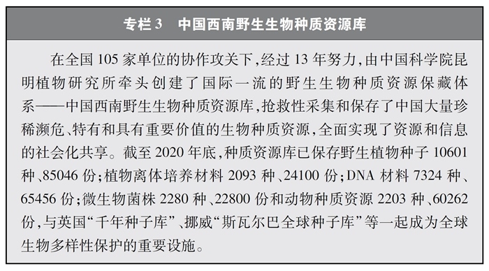 加快重要生物遺傳資源收集保存和利用。中國高度重視生物資源保護,近年來在生物資源調(diào)查、收集、保存等方面取得較大進(jìn)展。實施戰(zhàn)略生物資源計劃專項,完善生物資源收集收藏平臺,建立種質(zhì)資源創(chuàng)新平臺、遺傳資源衍生庫和天然化合物轉(zhuǎn)化平臺,持續(xù)加強野生生物資源保護和利用。實施一批種質(zhì)資源保護和育種創(chuàng)新項目,截至2020年底,形成了以國家作物種質(zhì)長期庫及其復(fù)份庫為核心、10座中期庫與43個種質(zhì)圃為支撐的國家作物種質(zhì)資源保護體系,建立了199個國家級畜禽遺傳資源保種場(區(qū)、庫),為90%以上的國家級畜禽遺傳資源保護名錄品種建立了國家級保種單位,長期保存作物種質(zhì)資源52萬余份、畜禽遺傳資源96萬份。建設(shè)99個國家級林木種質(zhì)資源保存庫,以及新疆、山東2個國家級林草種質(zhì)資源設(shè)施保存庫國家分庫,保存林木種質(zhì)資源4.7萬份。建設(shè)31個藥用植物種質(zhì)資源保存圃和2個種質(zhì)資源庫,保存種子種苗1.2萬多份。