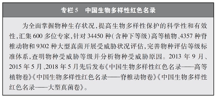 開展全國生物多樣性調(diào)查與評估。大力推進(jìn)生物多樣性保護重大工程實施,結(jié)合自然資源調(diào)查、生態(tài)系統(tǒng)監(jiān)測評估等工作,不斷完善生物多樣性調(diào)查與評估能力,首次將生物多樣性指標(biāo)納入生態(tài)質(zhì)量綜合評價指標(biāo)體系,引導(dǎo)地方加強生態(tài)文明建設(shè)與生物多樣性保護。開展自然資源調(diào)查,包括森林、草原、水、濕地、荒漠、海洋等,建立自然資源調(diào)查評價監(jiān)測制度。構(gòu)建了涵蓋2376個縣級行政單元、樣線總長超過3.4萬公里的物種分布數(shù)據(jù)庫,建立物種資源調(diào)查及收集信息平臺,準(zhǔn)確反映野生動植物空間分布狀況。完成長江經(jīng)濟帶、京津冀等國家戰(zhàn)略區(qū)域180多個縣級行政區(qū)生物多樣性調(diào)查與評估。組織開展近海漁業(yè)資源調(diào)查,初步掌握近海漁業(yè)資源狀況。陸續(xù)發(fā)布《中國植物紅皮書》《中國瀕危動物紅皮書》《中國物種紅色名錄》《中國生物多樣性紅色名錄》,基本掌握生物多樣性總體情況,為加強生物多樣性保護奠定了科學(xué)基礎(chǔ)。
