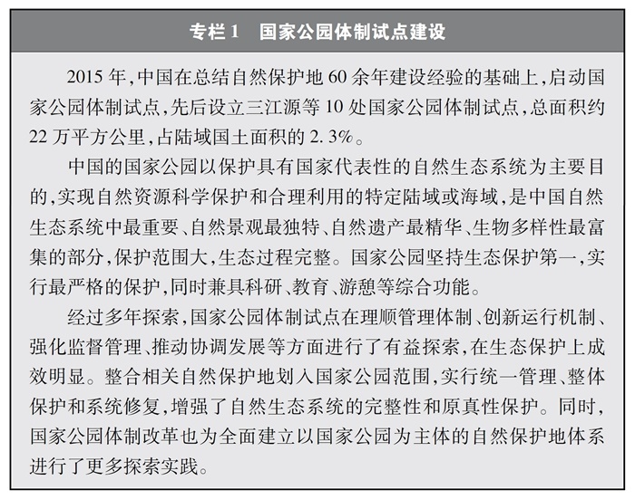 中國不斷推進(jìn)自然保護地建設(shè),啟動國家公園體制試點,構(gòu)建以國家公園為主體的自然保護地體系,率先在國際上提出和實施生態(tài)保護紅線制度,明確了生物多樣性保護優(yōu)先區(qū)域,保護了重要自然生態(tài)系統(tǒng)和生物資源,在維護重要物種棲息地方面發(fā)揮了積極作用。