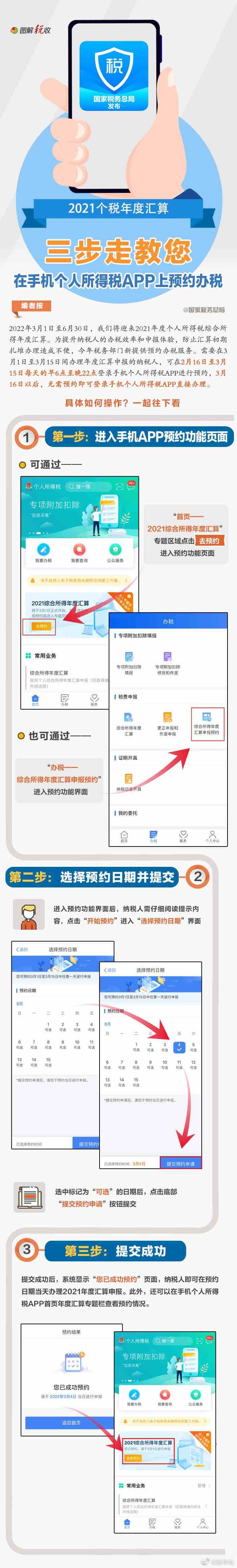 2022年3月1日至6月30日,我們將迎來2021年度個人所得稅綜合所得年度匯算。為提升納稅人的辦稅效率和申報(bào)體驗(yàn),今年稅務(wù)部門新提供預(yù)約辦稅服務(wù)。如何通過個人所得稅APP進(jìn)行預(yù)約辦稅?很簡單,三步走,手把手教你輕松搞定,看圖了解↓(記者 王雨蕭;圖片來源:國家稅務(wù)總局)