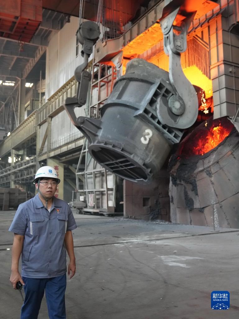 邯寶煉鋼廠特檔技術(shù)主管、轉(zhuǎn)爐車(chē)間副主任唐笑宇從轉(zhuǎn)爐附近經(jīng)過(guò)(2022年9月7日攝)。新華社記者 楊世堯 攝