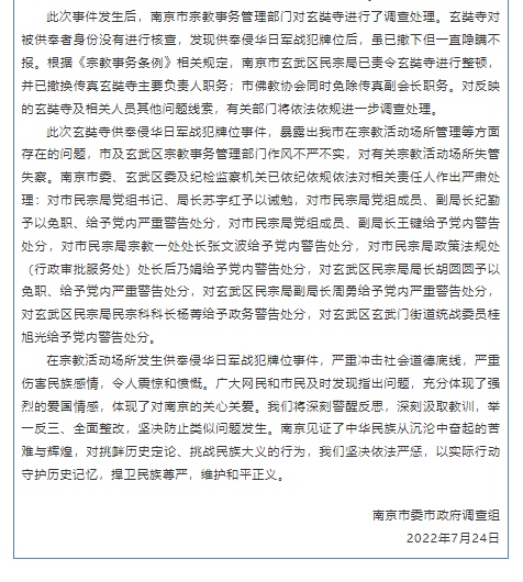 此次玄奘寺供奉侵華日軍戰(zhàn)犯牌位事件,暴露出我市在宗教活動場所管理等方面存在的問題,市及玄武區(qū)宗教事務(wù)管理部門作風(fēng)不嚴(yán)不實,對有關(guān)宗教活動場所失管失察。南京市委、玄武區(qū)委及紀(jì)檢監(jiān)察機(jī)關(guān)已依紀(jì)依規(guī)依法對相關(guān)責(zé)任人作出嚴(yán)肅處理:對市民宗局黨組書記、局長蘇宇紅予以誡勉,對市民宗局黨組成員、副局長紀(jì)勤予以免職、給予黨內(nèi)嚴(yán)重警告處分,對市民宗局黨組成員、副局長王鍵給予黨內(nèi)警告處分,對市民宗局宗教一處處長張文波給予黨內(nèi)警告處分,對市民宗局政策法規(guī)處(行政審批服務(wù)處)處長后乃娟給予黨內(nèi)警告處分,對玄武區(qū)民宗局局長胡圓圓予以免職、給予黨內(nèi)嚴(yán)重警告處分,對玄武區(qū)民宗局副局長周勇給予黨內(nèi)嚴(yán)重警告處分,對玄武區(qū)民宗局民宗科科長楊菁給予政務(wù)警告處分,對玄武區(qū)玄武門街道統(tǒng)戰(zhàn)委員桂旭光給予黨內(nèi)警告處分。