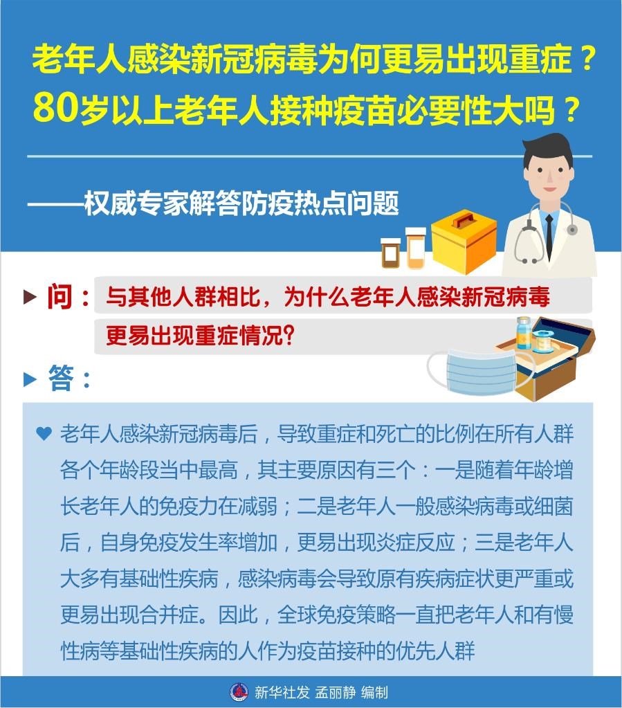 答:老年人感染新冠病毒后,導致重癥和死亡的比例在所有人群各個年齡段當中最高,其主要原因有三個:一是隨著年齡增長老年人的免疫力在減弱;二是老年人一般感染病毒或細菌后,自身免疫發(fā)生率增加,更易出現(xiàn)炎癥反應(yīng);三是老年人大多有基礎(chǔ)性疾病,感染病毒會導致原有疾病癥狀更嚴重或更易出現(xiàn)合并癥。因此,全球免疫策略一直把老年人和有慢性病等基礎(chǔ)性疾病的人作為疫苗接種的優(yōu)先人群。