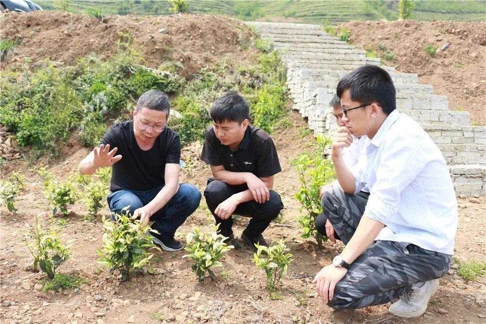 △浙江安吉縣農(nóng)技專家錢義榮(左一)在貴州普安縣地瓜鎮(zhèn)屯上村的“感恩茶園”中指導(dǎo)工作人員茶園管護(hù)技術(shù)。