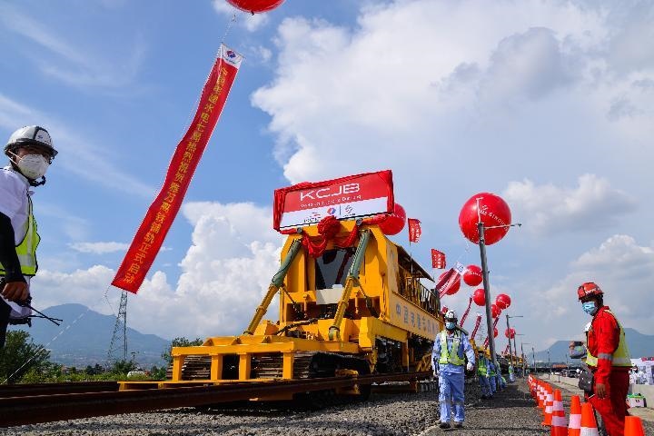 △工作人員在印度尼西亞萬隆雅萬高鐵鋪軌施工現(xiàn)場作業(yè)(2022年4月20日攝)。