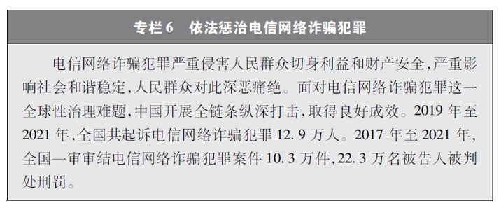 加大網(wǎng)絡(luò)犯罪懲治力度。隨著互聯(lián)網(wǎng)技術(shù)的快速發(fā)展,傳統(tǒng)犯罪加速向以互聯(lián)網(wǎng)為媒介的非接觸式犯罪轉(zhuǎn)變,電信網(wǎng)絡(luò)詐騙、網(wǎng)絡(luò)賭博、網(wǎng)絡(luò)淫穢色情等涉網(wǎng)違法犯罪多發(fā)。中國(guó)依法辦理新型網(wǎng)絡(luò)犯罪案件。連續(xù)多年開(kāi)展“凈網(wǎng)行動(dòng)”,嚴(yán)厲打擊群眾反映強(qiáng)烈的黑客攻擊破壞、侵犯公民個(gè)人信息等違法犯罪活動(dòng)。持續(xù)推進(jìn)“云劍”“斷卡”“斷流”“拔釘”等專項(xiàng)行動(dòng),打擊套路貸、校園貸、“以房養(yǎng)老”、“投資養(yǎng)老”等電信網(wǎng)絡(luò)詐騙犯罪,依法懲處為電信網(wǎng)絡(luò)詐騙犯罪團(tuán)伙提供互聯(lián)網(wǎng)接入、域名注冊(cè)、服務(wù)器托管、移動(dòng)互聯(lián)網(wǎng)應(yīng)用程序制作開(kāi)發(fā)、網(wǎng)絡(luò)支付、引流推廣等服務(wù)支撐的黑灰產(chǎn)業(yè)。完善國(guó)家反詐大數(shù)據(jù)平臺(tái)和反詐移動(dòng)互聯(lián)網(wǎng)應(yīng)用程序,建設(shè)國(guó)家涉詐黑樣本庫(kù),完善快速止付凍結(jié)機(jī)制、涉詐資金返還機(jī)制。堅(jiān)決打擊網(wǎng)絡(luò)賭博犯罪行為,從嚴(yán)治理網(wǎng)絡(luò)淫穢色情。網(wǎng)絡(luò)犯罪治理工作取得明顯成效,人民群眾安全感有效提升,社會(huì)更加和諧穩(wěn)定。