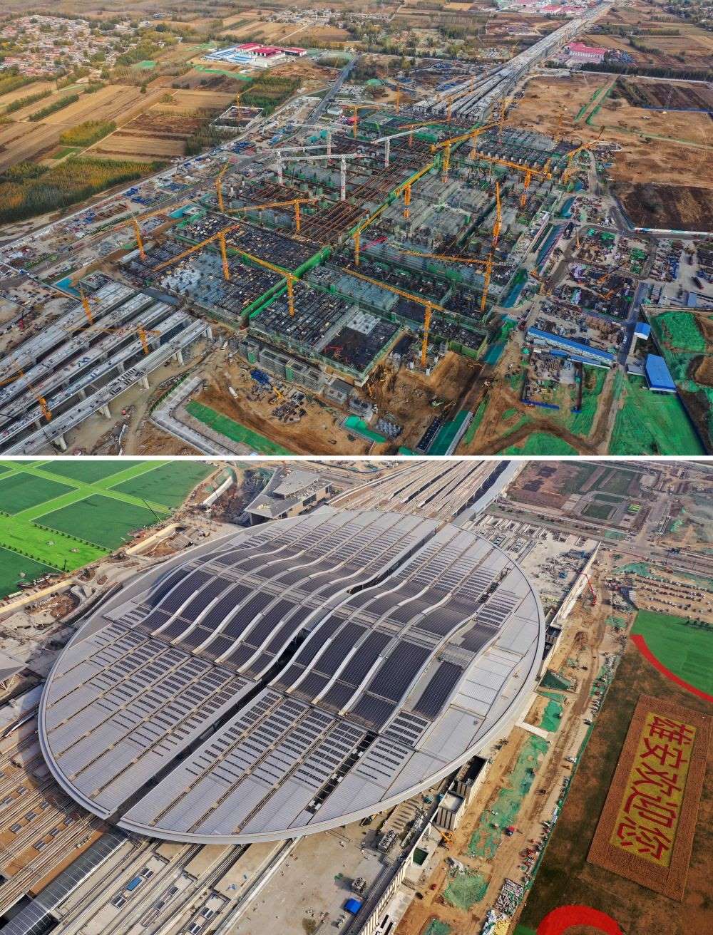 拼版照片:上圖為建設(shè)中的雄安站(無人機(jī)照片,2019年11月7日攝);下圖為建成的雄安站(無人機(jī)照片,2021年4月1日攝)。