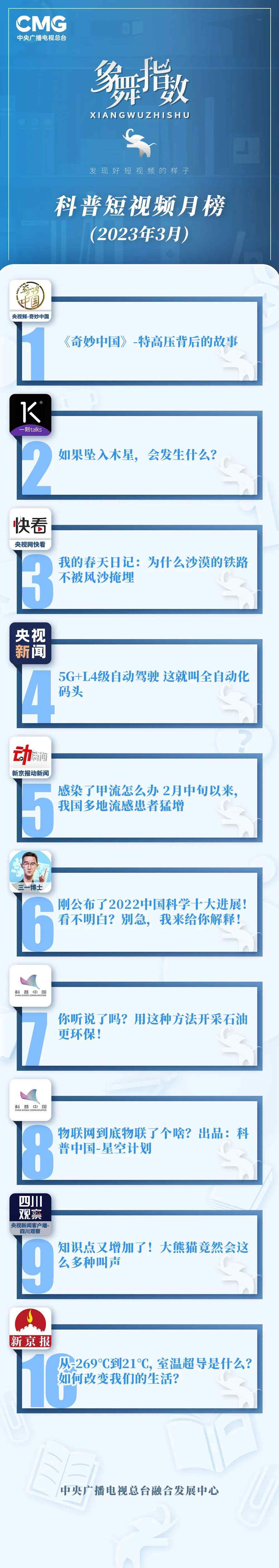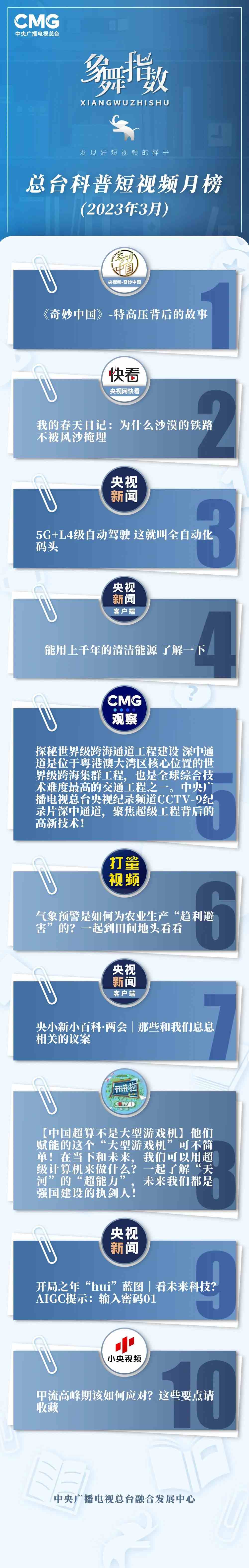 中央廣播電視總臺(tái)“象舞指數(shù)”評議品牌,推出科普短視頻月榜、總臺(tái)科普短視頻月榜。在2023年3月,值得注目的內(nèi)容有: