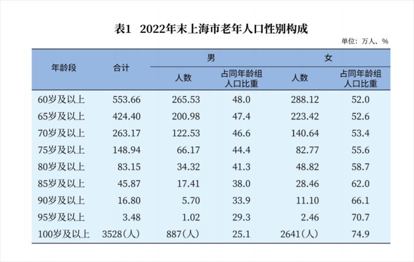 統(tǒng)計數(shù)據(jù)顯示,2022年上海戶籍人口1505.19萬人。60歲及以上老年人口553.66萬人,占總人口的36.8%;65歲及以上老年人口424.40萬人,占總人口的28.2%;70歲及以上老年人口263.17萬人,占總人口的17.5%;80歲及以上高齡老年人口83.15萬人,占60歲及以上老年人口的15.0%,占總人口的5.5%;100歲及以上老年人口3528人,其中男性887人,女性2641人。