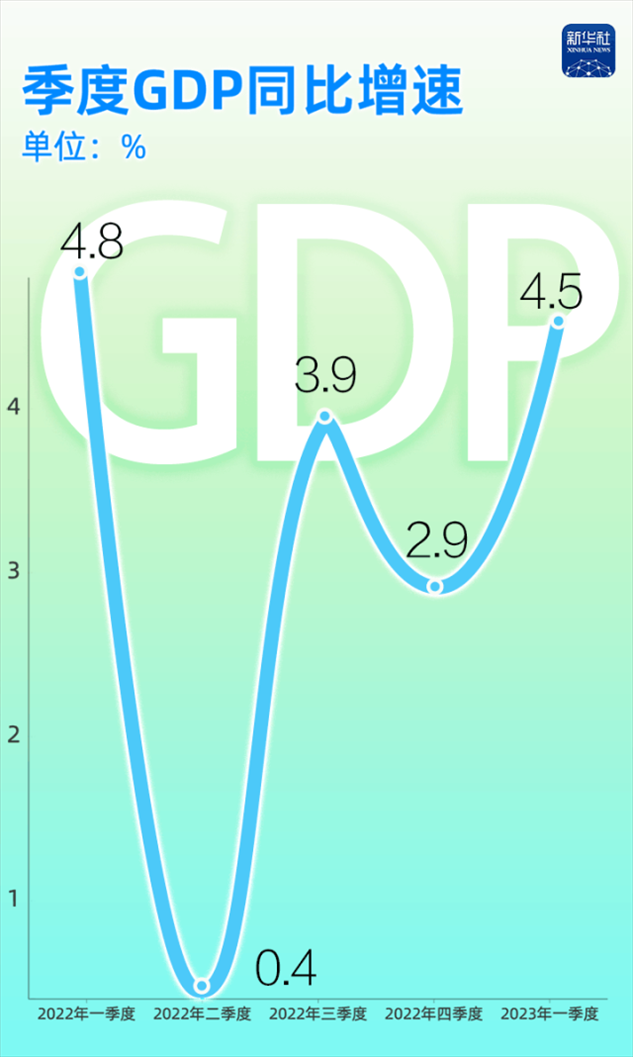 有數(shù)為證:2022年至今,我國(guó)的季度GDP同比增速分別為4.8%、0.4%、3.9%、2.9%和4.5%,一季度GDP增速達(dá)到了2022年二季度以來最高水平。