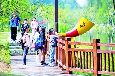 游客在湖南常德桃花源風景名勝區(qū)體驗“噴泉”游戲。新華社發(fā)