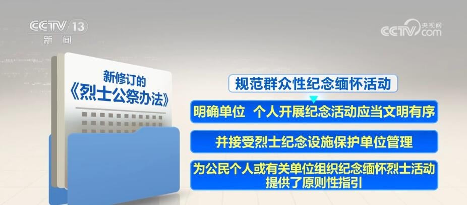新修訂的《烈士公祭辦法》自5月1日起施行。其中,強調(diào)發(fā)揮公祭活動對青少年的教育作用,要求各級各類學(xué)校組織學(xué)生以適當(dāng)方式參加烈士公祭,加強愛國主義、集體主義、社會主義教育。規(guī)范群眾性紀念緬懷活動,明確單位、個人開展紀念活動應(yīng)當(dāng)文明有序,并接受烈士紀念設(shè)施保護單位管理,為公民個人或有關(guān)單位組織紀念緬懷烈士活動提供了原則性指引。