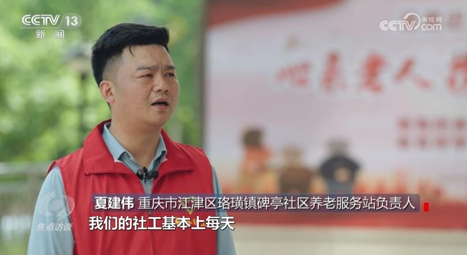 重慶市江津區(qū)珞璜鎮(zhèn)碑亭社區(qū)養(yǎng)老服務(wù)站負(fù)責(zé)人夏建偉:“一天下來,滿滿當(dāng)當(dāng)?shù)模覀兊纳绻せ旧厦刻於汲^了兩萬三千步的樣子。雖然說很累,但是每一個社工都很愉快,都覺得在這個過程當(dāng)中找到了快樂,也找到了成就感?!?/p>