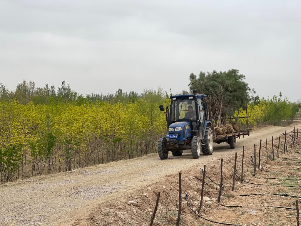寧夏靈武白芨灘國(guó)家級(jí)自然保護(hù)區(qū)馬鞍山林場(chǎng)內(nèi),一輛拖拉機(jī)在運(yùn)送樹苗。新華社記者蘇醒 攝