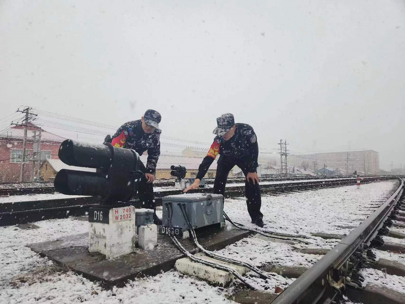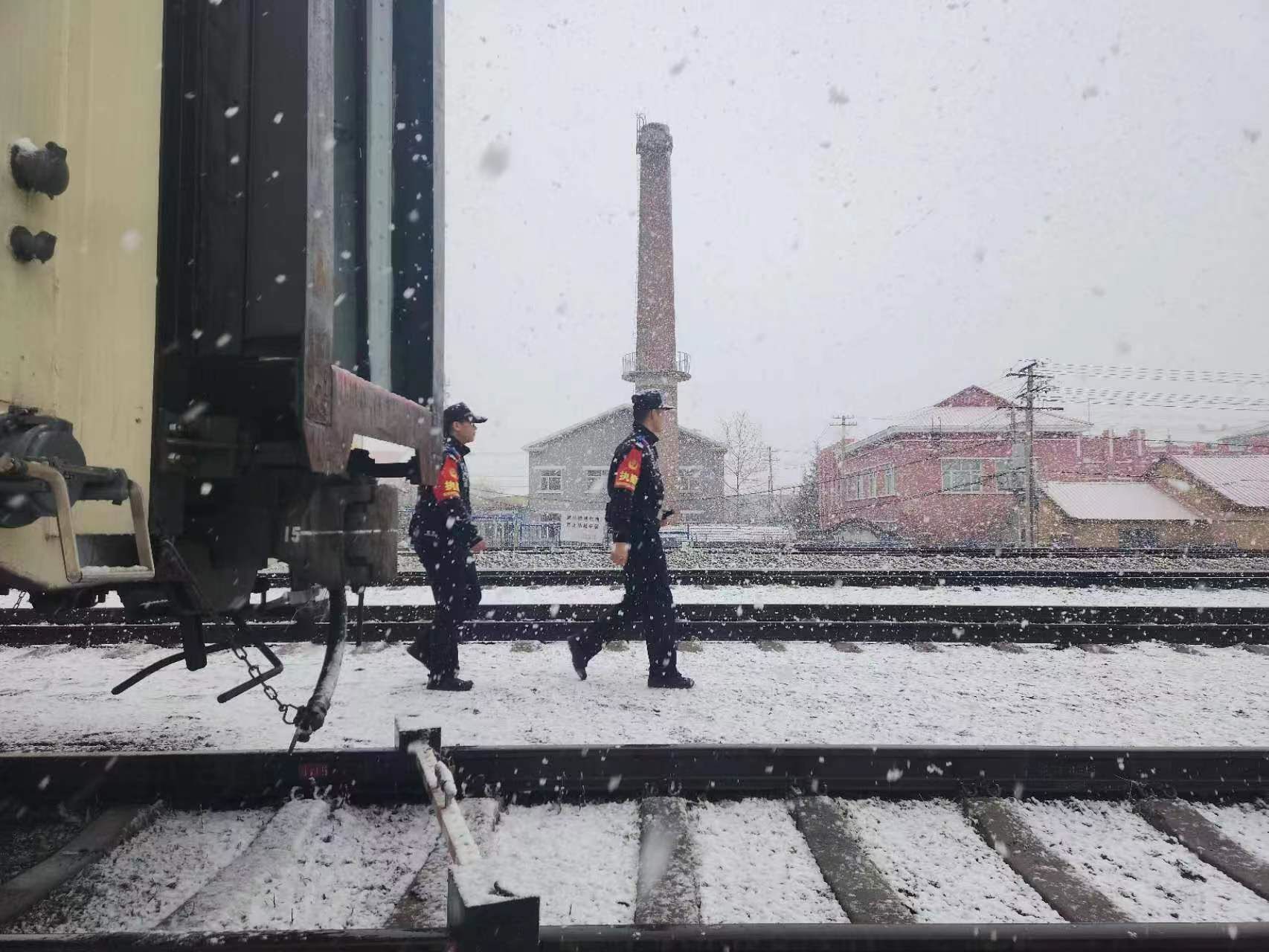 2023年4月30日,內(nèi)蒙古自治區(qū)根河市,海拉爾鐵路公安處根河站派出所民警在風(fēng)雪中巡邏。五一假期,位于大興安嶺深處的根河市迎來(lái)降雪天氣,根河站派出所民警在風(fēng)雪中堅(jiān)守工作崗位,確保旅客出行安全。 張磊 攝