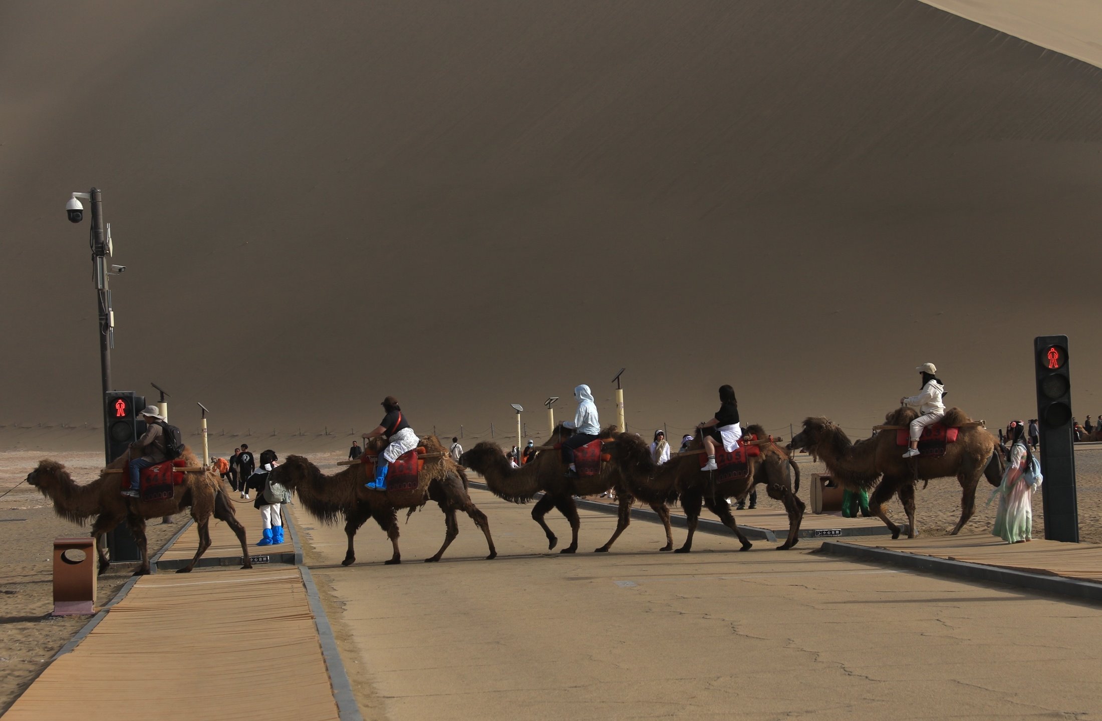 “五一”假期,甘肅省敦煌市鳴沙山月牙泉景區(qū)迎來旅游高峰。設(shè)置在該景區(qū)內(nèi)行人步道和駱駝通道兩個(gè)交叉點(diǎn)的“駱駝紅綠燈”,引導(dǎo)人、車和駱駝?dòng)行蚍至?,不僅確保了景區(qū)交通安全暢通,也成為景區(qū)內(nèi)的“網(wǎng)紅打卡點(diǎn)”之一 。
