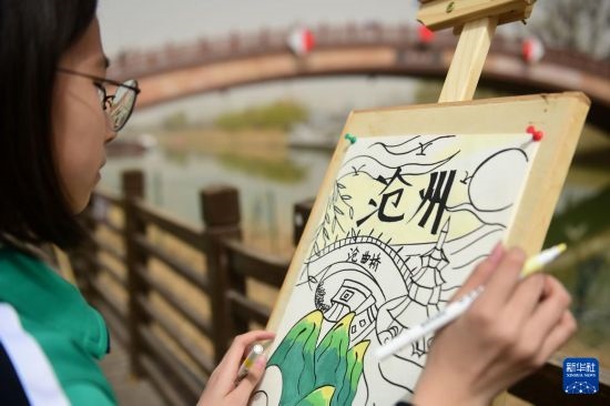 3月28日,參加公益研學(xué)活動(dòng)的學(xué)生在描畫運(yùn)河景色。