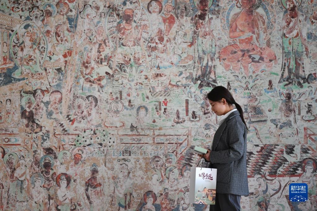敦煌研究院文物數(shù)字化保護團隊創(chuàng)意營銷人員廖雪婷從一幅高保真復(fù)制壁畫前走過(4月25日攝)。