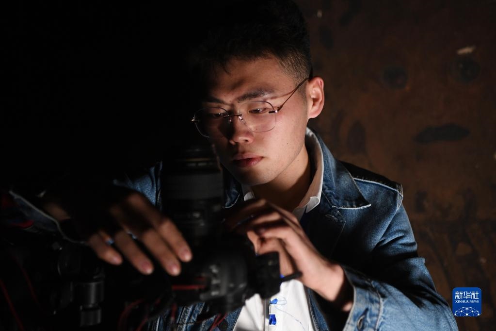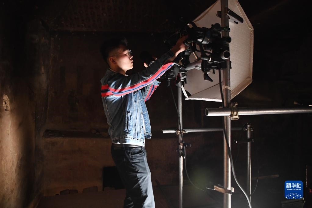 敦煌研究院文物數(shù)字化保護團隊圖像采集人員熊業(yè)騰在洞窟內(nèi)調(diào)試設(shè)備,準(zhǔn)備進行壁畫圖像采集(4月25日攝)。