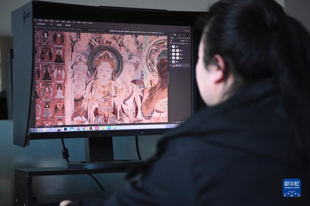 敦煌研究院文物數(shù)字化保護團隊圖像處理人員年海麗在拼接壁畫圖像(4月25日攝)。