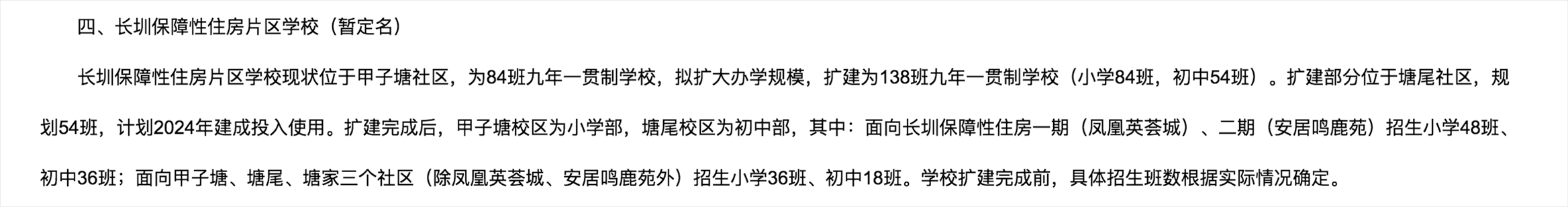 根據(jù)最新的學(xué)區(qū)劃分方案,長圳保障性住房片區(qū)學(xué)校現(xiàn)狀位于甲子塘社區(qū),為84班九年一貫制學(xué)校,擬擴(kuò)大辦學(xué)規(guī)模,擴(kuò)建為138班九年一貫制學(xué)校(小學(xué)84班,初中54班)。擴(kuò)建部分位于塘尾社區(qū),規(guī)劃54班,計(jì)劃2024年建成投入使用。擴(kuò)建完成后,甲子塘校區(qū)為小學(xué)部,塘尾校區(qū)為初中部,其中:面向長圳保障性住房一期(鳳凰英薈城)、二期(安居鳴鹿苑)招生小學(xué)48班、初中36班;面向甲子塘、塘尾、塘家三個社區(qū)(除鳳凰英薈城、安居鳴鹿苑外)招生小學(xué)36班、初中18班。