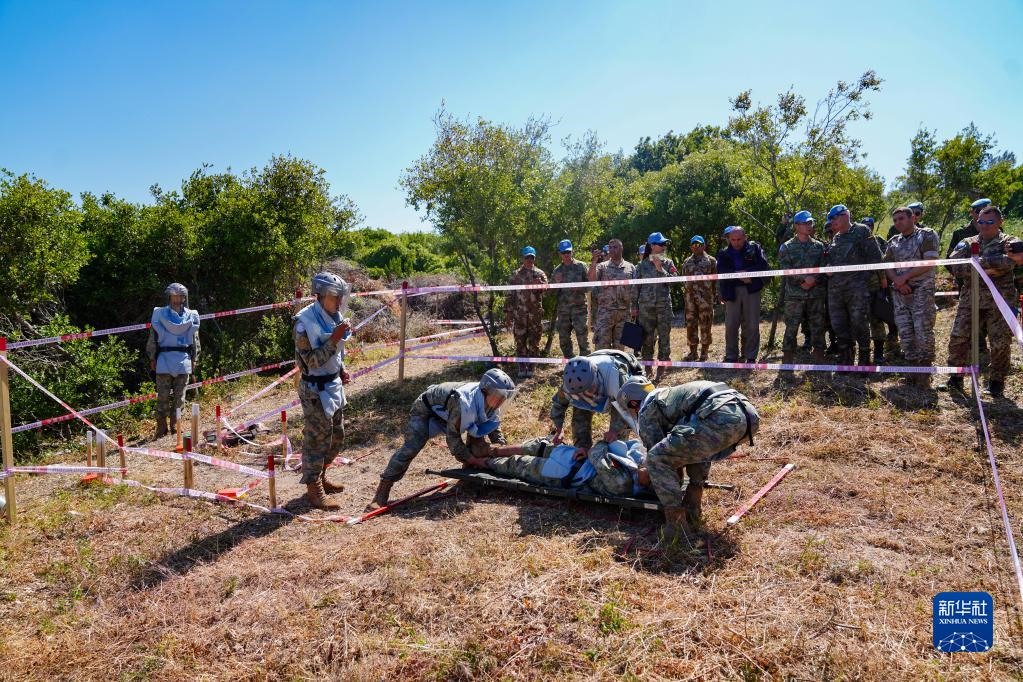 5月3日,在黎巴嫩南部邊境“藍線”附近雷場,參與演習的中國第21批赴黎巴嫩維和多功能工兵分隊醫(yī)療組對“傷員”傷情進行前期處置。