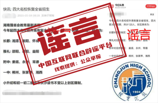 真相:近日,一些網(wǎng)站和自媒體平臺(tái)發(fā)布“今年起,長(zhǎng)郡中學(xué)、雅禮中學(xué)、湖南師大附中、長(zhǎng)沙市一中等長(zhǎng)沙‘四大名?!跎呋謴?fù)全省招生”的信息引發(fā)關(guān)注。5月4日,湖南省教育廳對(duì)此發(fā)布聲明稱(chēng),此消息為不實(shí)消息。湖南省自2021年全面規(guī)范普通高中招生,禁止跨區(qū)域招生,并對(duì)違規(guī)招生行為進(jìn)行嚴(yán)肅查處。請(qǐng)大家不信謠不傳謠。(來(lái)源:湖南省教育廳微信公眾號(hào))