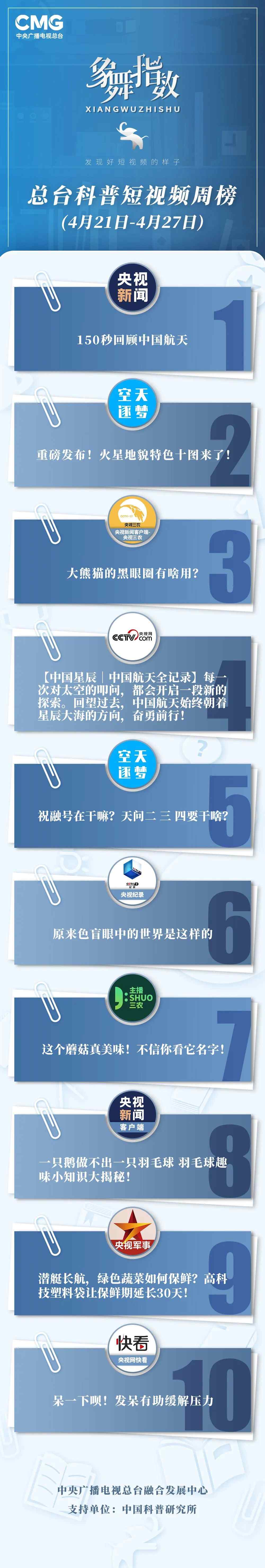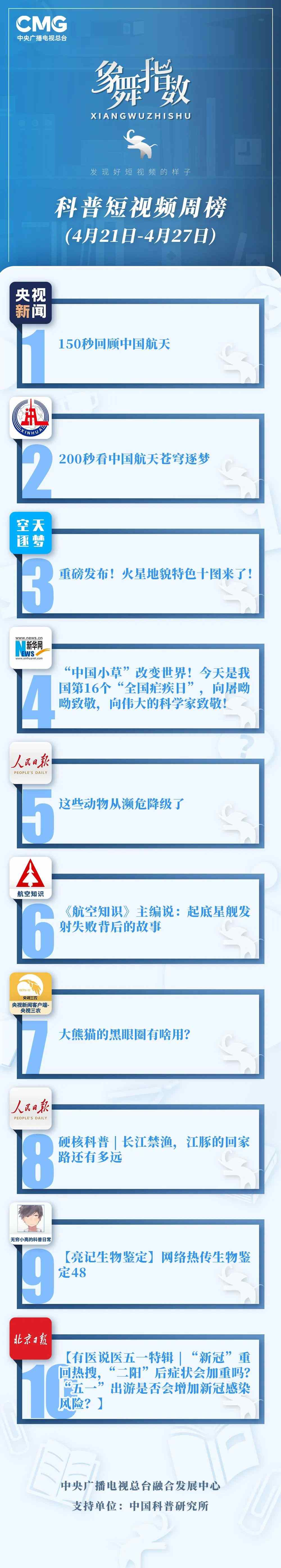 中央廣播電視總臺(tái)“象舞指數(shù)”評(píng)議品牌,推出科普短視頻周榜、總臺(tái)科普短視頻周榜。在2023年4月21日-4月27日,值得注目的內(nèi)容有:
