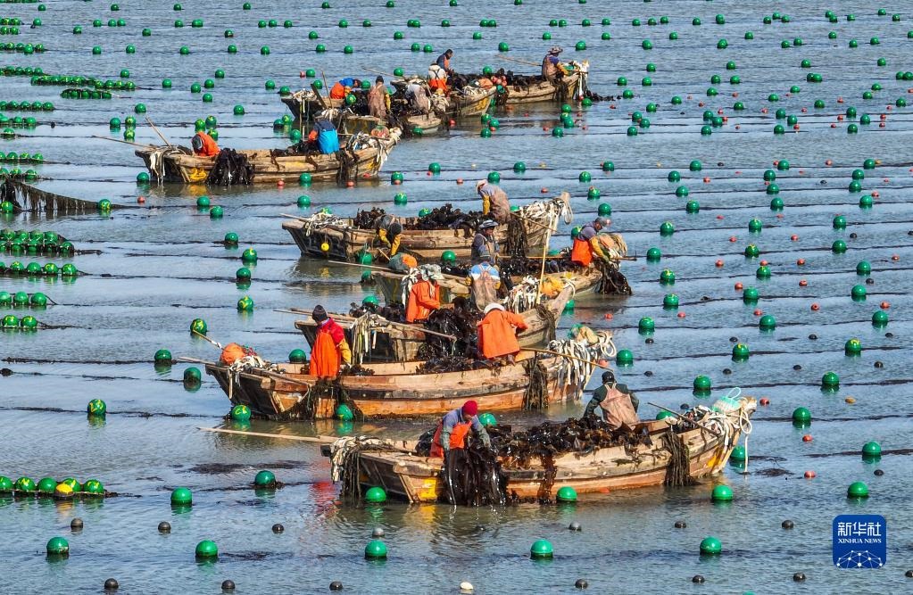 5月8日,在山東省榮成市愛(ài)倫灣海域海帶養(yǎng)殖區(qū),漁民采收海帶(無(wú)人機(jī)照片)。