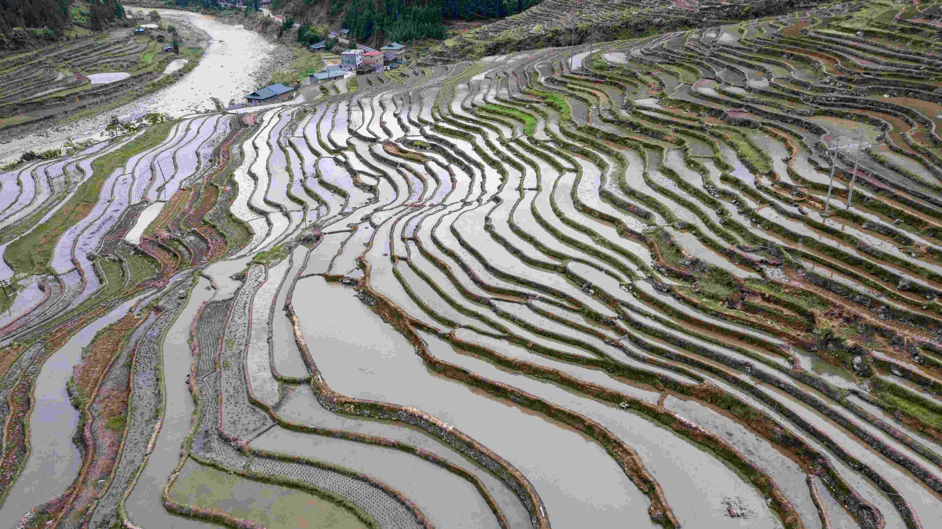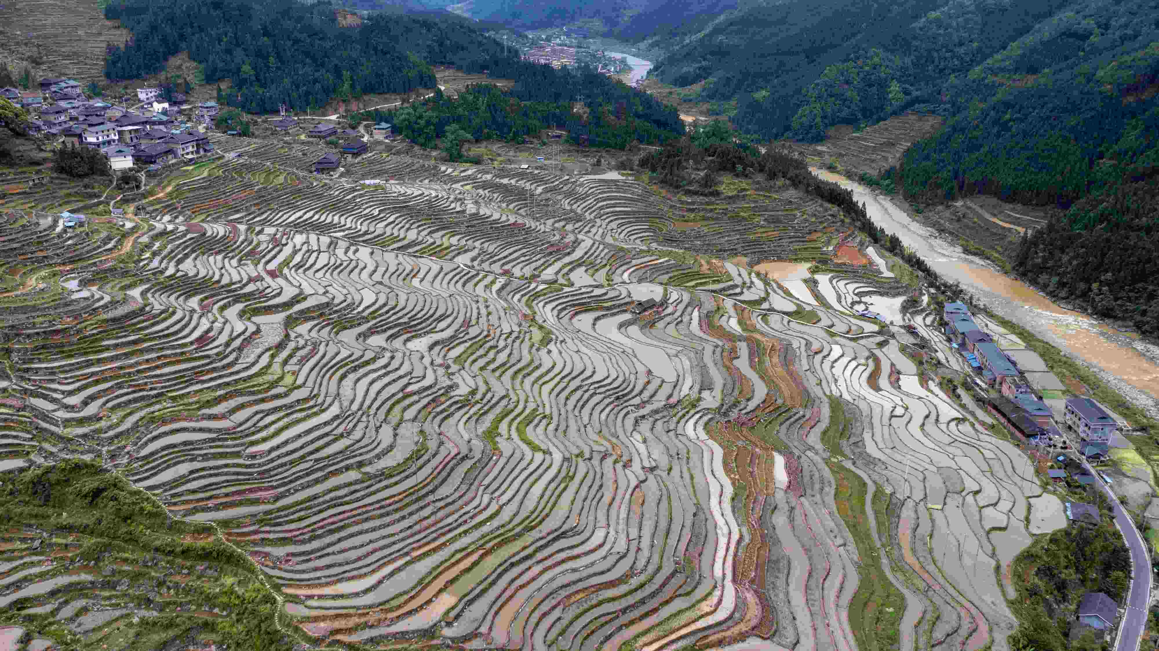 2023年5月7日,貴州省黔東南苗族侗族自治州,從江縣剛邊壯族鄉(xiāng)境內(nèi)田園生機勃勃,翻耕后的層層梯田和青山、河流、村落相映成趣,構(gòu)成一幅鄉(xiāng)村美景圖畫。
