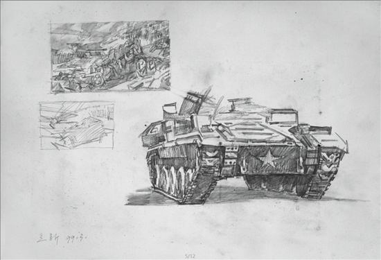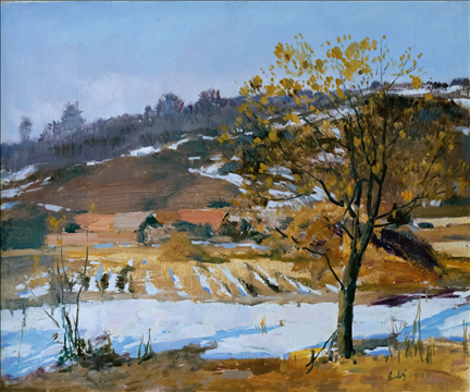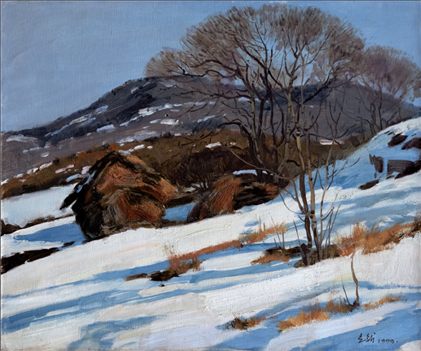 《激戰(zhàn)松骨峰》描繪的是抗美援朝戰(zhàn)爭中,中國人民志愿軍與美軍激烈廝殺的悲壯場面。作者從動態(tài)型的構圖與形象表層,把戰(zhàn)爭集團之間的搏殺以濃重的筆調展現(xiàn)開來,表現(xiàn)了中國人民志愿軍英勇頑強、熱愛自由和勇于犧牲的精神,展示了歷史的悲劇性沖突。作者從沉甸甸的歷史中找到戰(zhàn)爭中最慘烈、最殘酷、最能表現(xiàn)人物悲劇性命運的瞬間,用現(xiàn)實主義的創(chuàng)作手法,扎實、生動地塑造了一個又一個志愿軍勇士的形象。硝煙籠罩著戰(zhàn)場,鮮血與白雪融合成冰,敵我雙方,犬牙交錯,生死搏殺。同時,也使我們感受到戰(zhàn)爭的殘酷與生命的脆弱。作者處理宏大的戰(zhàn)爭場面獨具匠心:陽光透過硝煙,有節(jié)奏地營造出戰(zhàn)場的空間;雪地上被間隔的藍色陰影,反襯出黃褐色的主調。作品對細部進行了恰如其分的刻畫,但又不失對整體宏觀的把握,厚重的色彩中透出熱情,樸拙的筆觸映著畫家的激動。