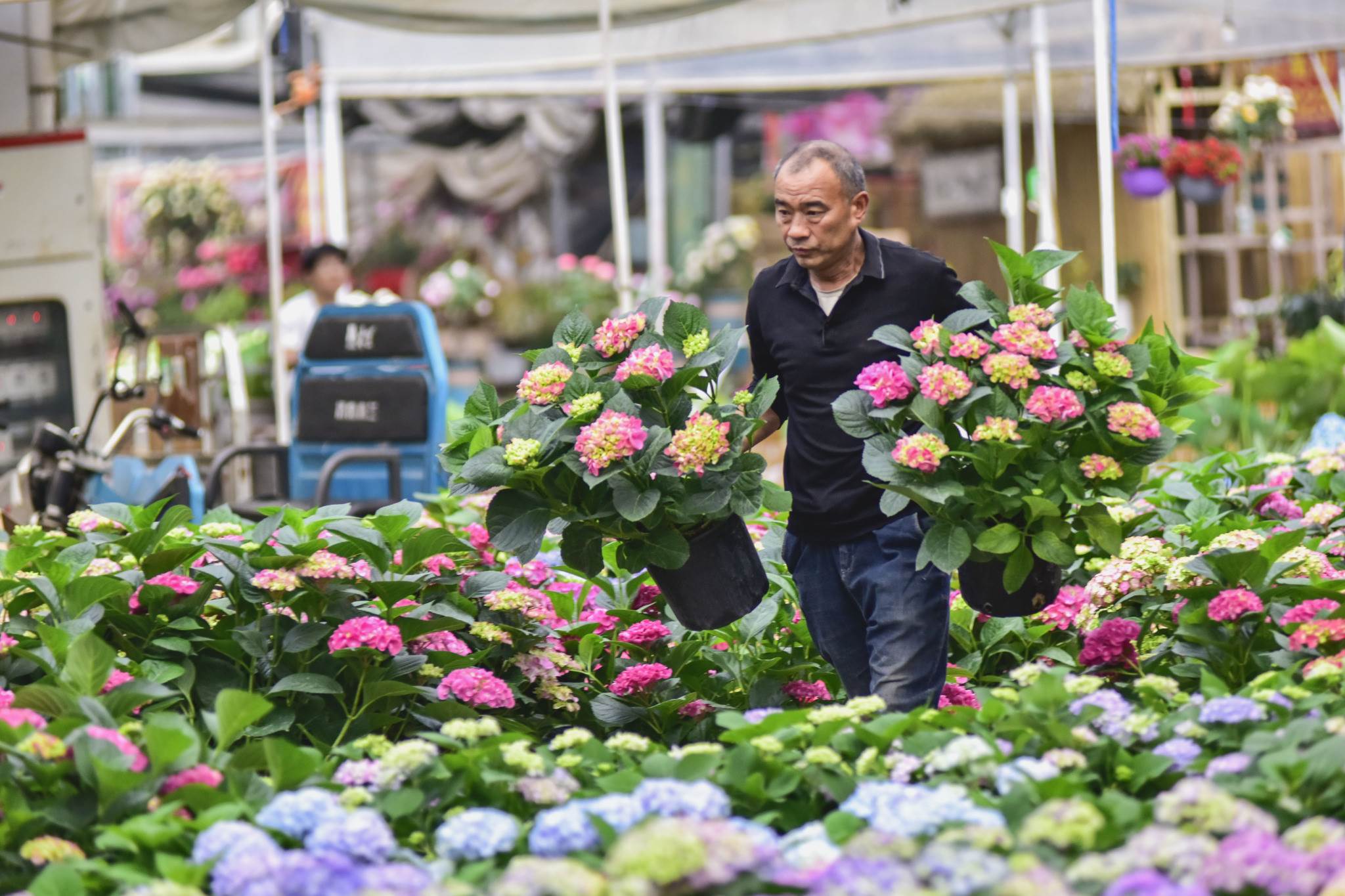 隨著母親節(jié)臨近,山東省青州市花卉苗木交易中心生意紅火起來,色彩艷麗且寓意吉祥的康乃馨、繡球、長壽花等受到消費(fèi)者青睞。視覺中國