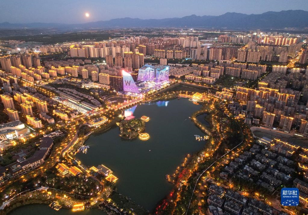 西安曲江新區(qū)日落時分的城市景色(2022年6月14日攝,無人機照片)。