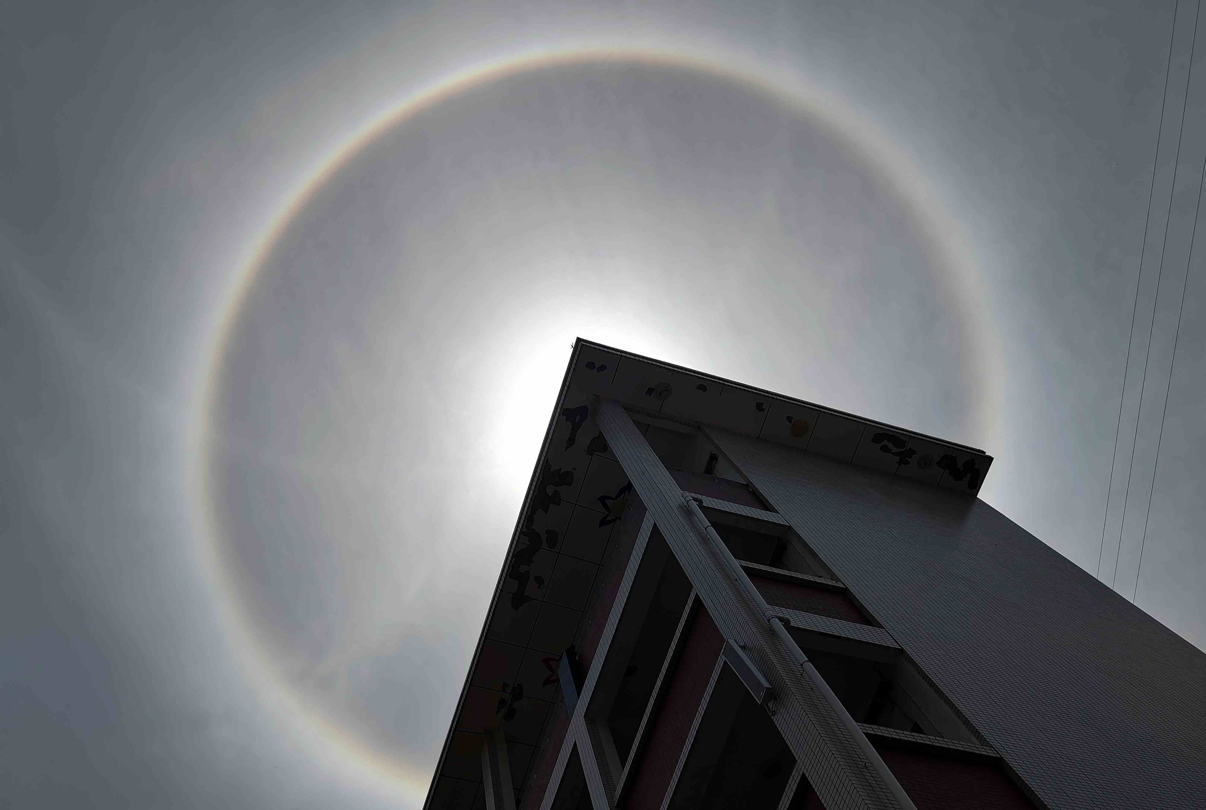 2023年5月15日中午,湖北宜昌,天空出現(xiàn)日暈景觀。當(dāng)日,多地天空出現(xiàn)日暈。日暈是一種大氣光學(xué)現(xiàn)象,是太陽光通過云層中的冰晶折射或反射而形成的。 視覺中國