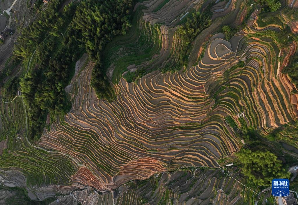 5月17日拍攝的夕陽(yáng)映照下的紫鵲界梯田(無(wú)人機(jī)照片)。