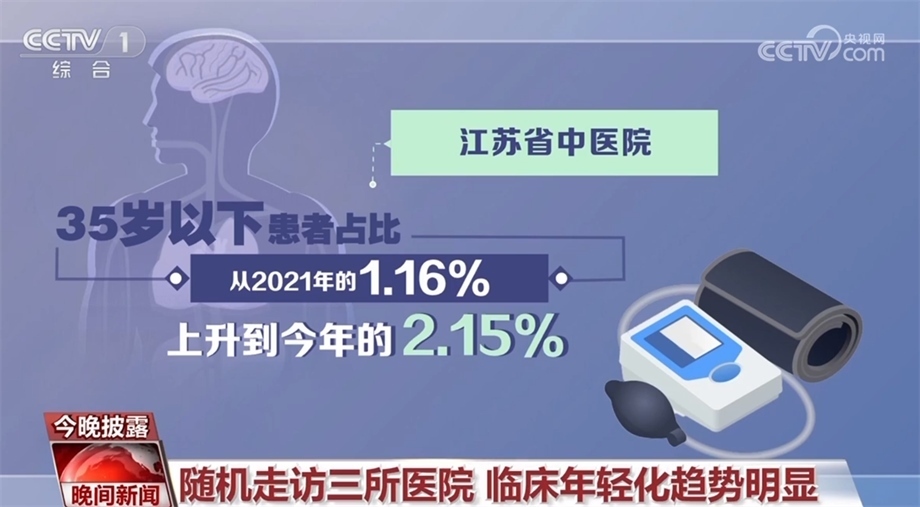 總臺記者隨機走訪了北京、江蘇、河南三所醫(yī)院的高血壓門診發(fā)現(xiàn):河南省洛陽市第一人民醫(yī)院,2022年接診的3000多名患者中,低于30歲的有21人;江蘇省中醫(yī)院,35歲以下患者占比從2021年的1.16%,上升到今年的2.15%;北京安貞醫(yī)院的數(shù)據(jù)則顯示,70%的門診患者為中青年群體。