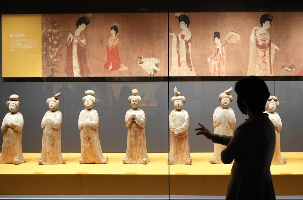 2022年4月13日,觀眾在西安博物院參觀唐代女立俑。 新華社記者 李一博 攝
