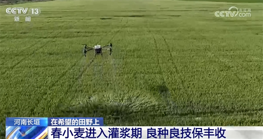目前,河南長垣的春小麥進入灌漿期,在長垣黃河灘區(qū)的高標準農田,種糧大戶正在通過植保無人機對已經到灌漿期的小麥實施針對“干熱風”“爛場雨”噴防,以應對眼下的高溫天氣。