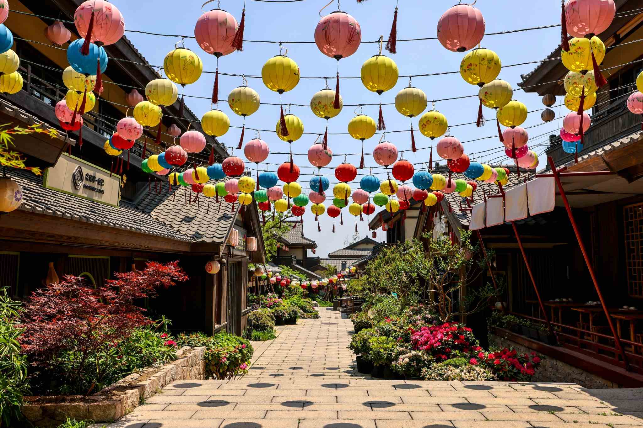 2023年5月19日,青島,西海岸新區(qū)藏馬鎮(zhèn),鑲嵌在藏馬山山麓的網(wǎng)紅“打卡地”阿朵花嶼美不勝收。漫步在這個唐風古鎮(zhèn)中,繽紛花色點綴在建筑之間,好似畫中景色,讓人流連沉醉。視覺中國