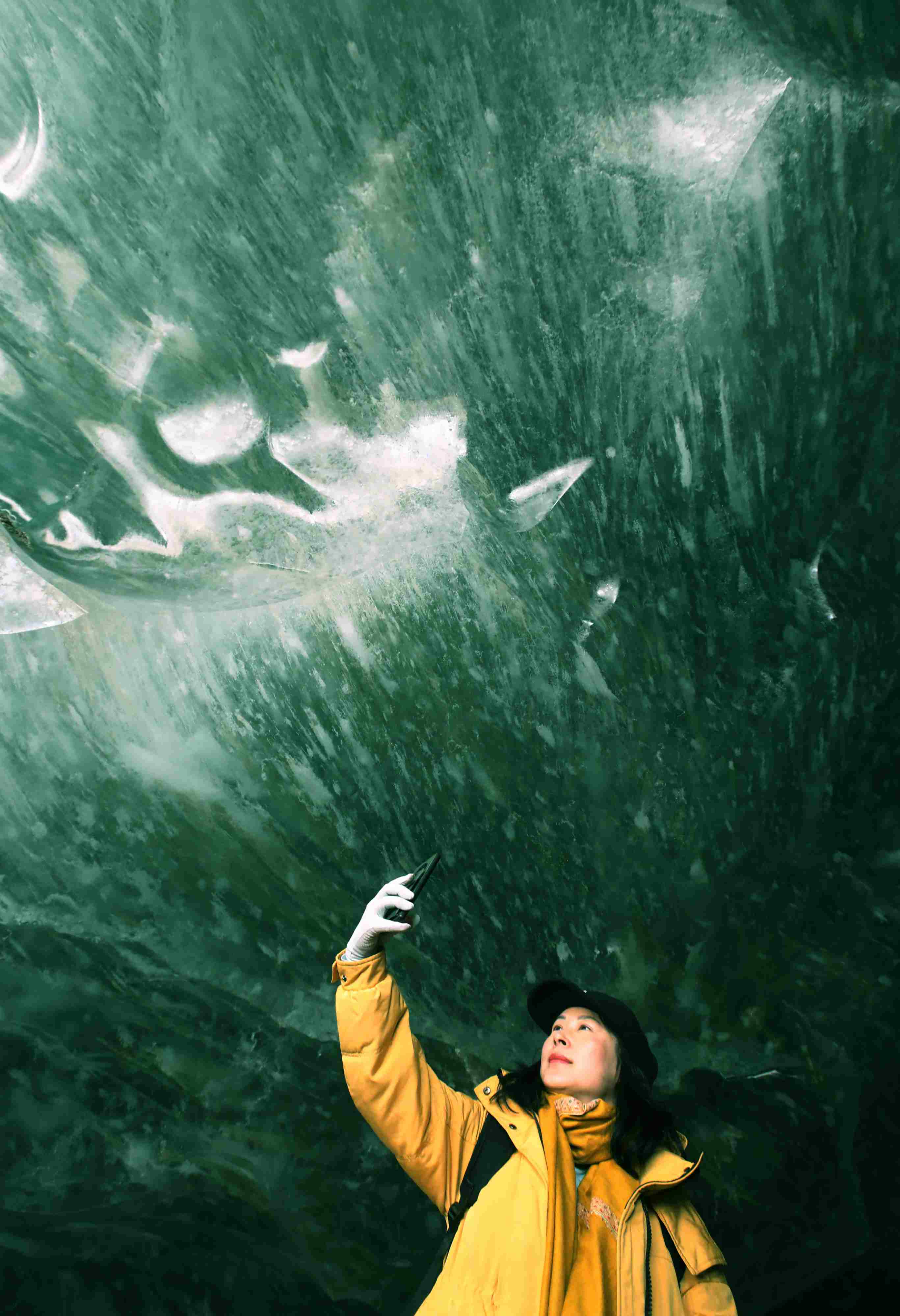 2023年5月21日,西藏昌都,游客在邊壩縣普玉一村游覽冰洞。據(jù)初步勘測(cè),貫穿的冰洞長(zhǎng)約165米、寬約26米、高約15米。呈弧拱造型的冰洞內(nèi)壁上皆是晶瑩剔透的冰柱、冰簾、冰花,其頂部呈“魚(yú)鱗”狀,在陽(yáng)光的照射下,呈現(xiàn)出夢(mèng)幻般的景象。 視覺(jué)中國(guó)