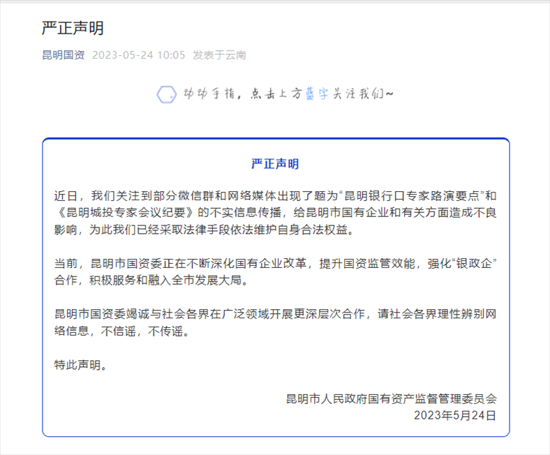 ·昆明市國(guó)資委發(fā)布聲明,“昆明銀行口專家路演要點(diǎn)”和《昆明城投專家會(huì)議紀(jì)要》不實(shí)。