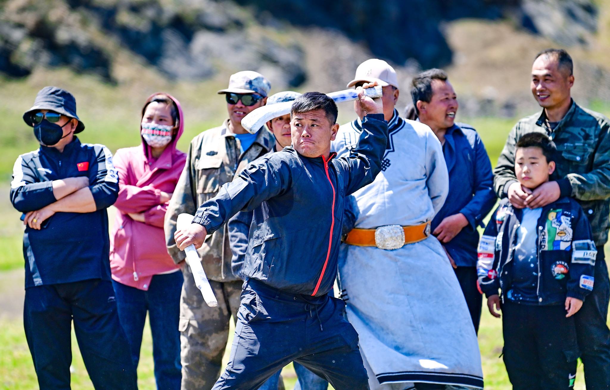 2023年5月26日,內(nèi)蒙古興安盟,科爾沁右翼前旗德伯斯鎮(zhèn)阿日林一合嘎查舉行首屆那達(dá)慕,設(shè)置的賽馬、布魯、搏克、拔河等傳統(tǒng)體育娛樂項目,吸引嘎查周邊500余名牧民參加比賽,喜慶牧業(yè)豐收季。視覺中國
