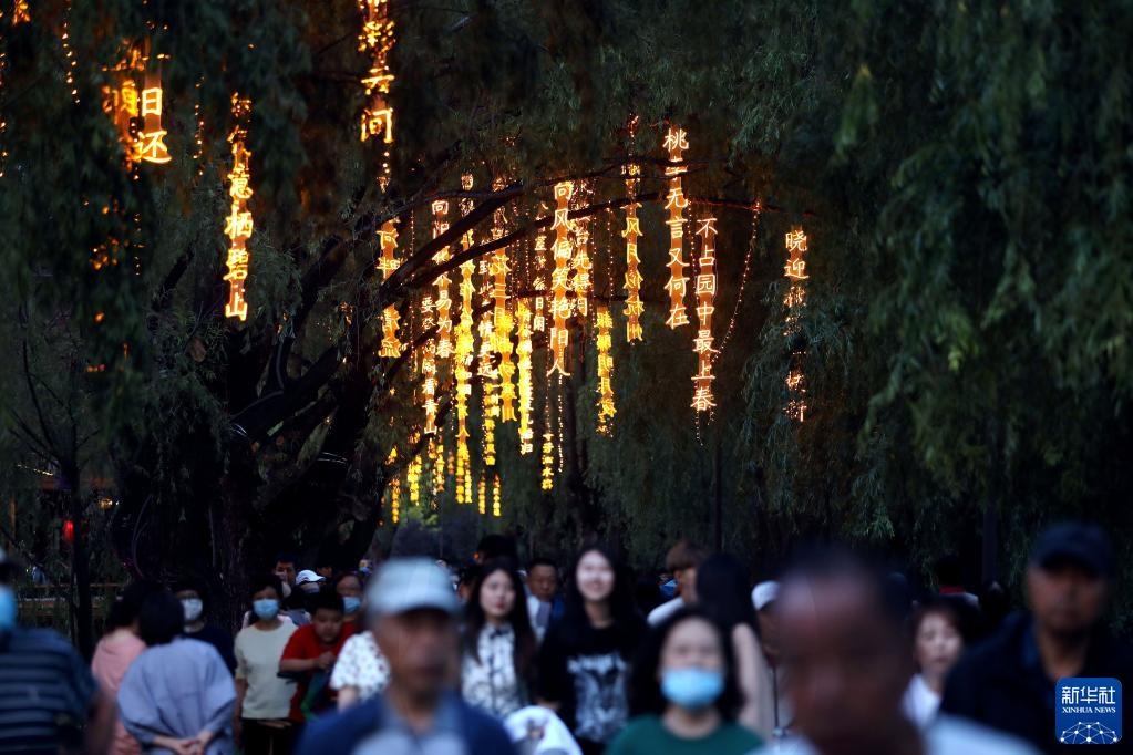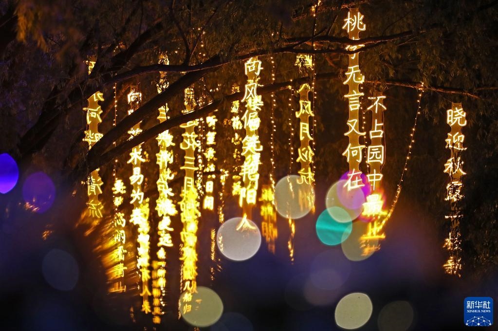 近日,沈陽(yáng)市萬(wàn)泉公園打造的一條詩(shī)詞漫道成為游客和市民的網(wǎng)紅打卡地。每當(dāng)夜幕降臨,幾十首古詩(shī)詞彩燈在這條300余米道路的樹梢枝頭熠熠閃爍,以詩(shī)入景,一步一詩(shī)。新華社記者 姚劍鋒 攝