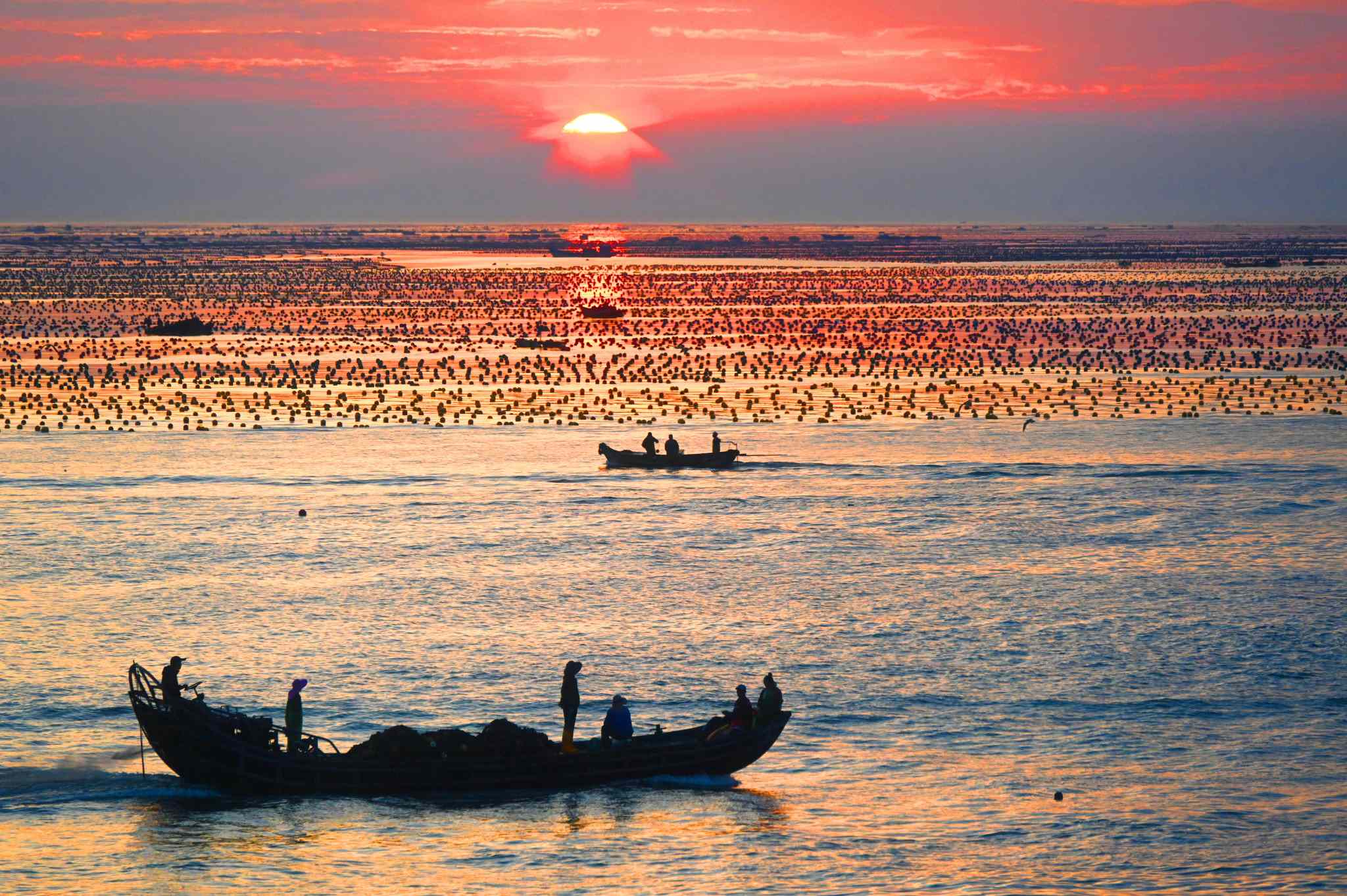 2023年5月31日,山東威海,榮成愛倫灣海洋牧場,漁民駕駛船只在海上收獲海帶,美麗的朝霞倒影在海上,海鷗伴舞,海洋牧場到處呈現(xiàn)一派豐收的喜人景象。視覺中國