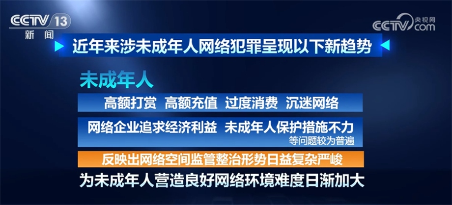 據(jù)最高檢相關部門負責人介紹,近年來涉未成年人網(wǎng)絡犯罪呈現(xiàn)以下新趨勢:未成年人觸網(wǎng)低齡化日趨明顯,更易遭受網(wǎng)絡不法侵害;利用網(wǎng)絡侵害未成年人犯罪手段復雜多樣,方式不斷翻新,“網(wǎng)絡誘騙”“隔空猥褻”等新類型犯罪隱蔽性強、打擊難度大;一些未成年人通過網(wǎng)絡接觸暴力、色情、毒品、低俗等不良信息,導致形成不健康價值觀,甚至盲目跟風、走向違法犯罪;未成年人高額打賞、高額充值、過度消費、沉迷網(wǎng)絡,網(wǎng)絡企業(yè)追求經濟利益、未成年人保護措施不力等問題較為普遍,反映出網(wǎng)絡空間監(jiān)管整治形勢日益復雜嚴峻,為未成年人營造良好網(wǎng)絡環(huán)境難度日漸加大。