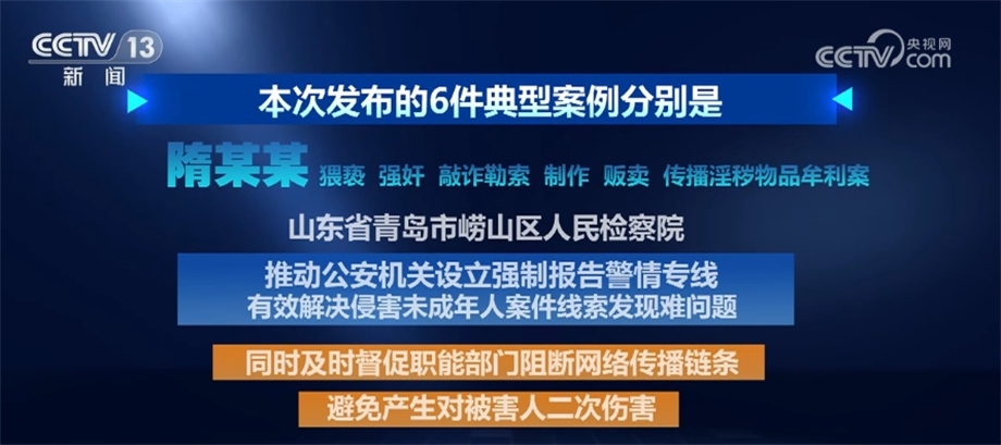 隋某某猥褻、強奸、敲詐勒索、制作、販賣、傳播淫穢物品牟利案。山東省青島市嶗山區(qū)人民檢察院推動公安機關設立強制報告警情專線,有效解決侵害未成年人案件線索發(fā)現(xiàn)難問題。同時,及時督促職能部門阻斷網(wǎng)絡傳播鏈條,避免產生對被害人二次傷害。