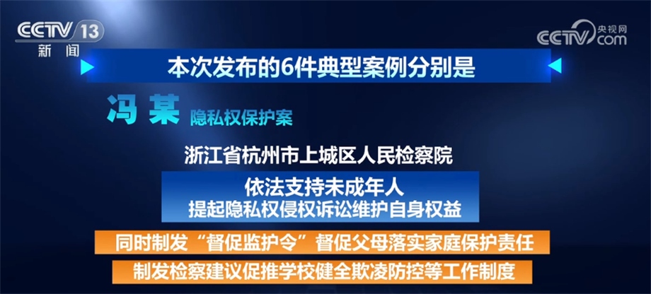 馮某隱私權保護案。針對未成年人隱私視頻被轉發(fā),生活學習受到影響,浙江省杭州市上城區(qū)人民檢察院依法支持未成年人提起隱私權侵權訴訟維護自身權益。同時,制發(fā)“督促監(jiān)護令”督促父母落實家庭保護責任,制發(fā)檢察建議促推學校健全欺凌防控等工作制度。