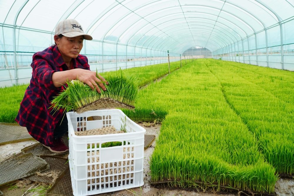 5月20日,山東省東營(yíng)市墾利區(qū)黃河口鎮(zhèn),農(nóng)戶(hù)在培育海水稻秧苗。新華社記者 徐速繪 攝