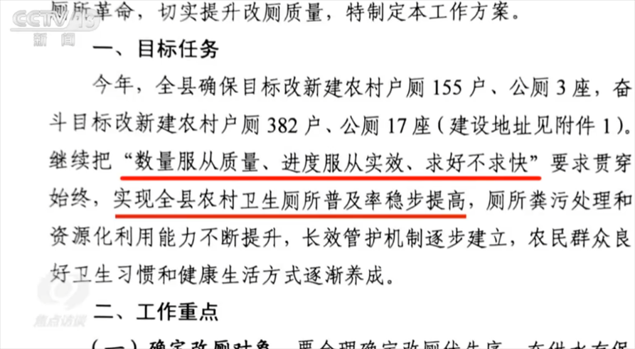 央視網(wǎng)消息(焦點(diǎn)訪談):“小廁所、大民生”。廁所問題不僅關(guān)系農(nóng)村人居環(huán)境的改善,也關(guān)系廣大人民群眾生活品質(zhì)的提升。目前,全國農(nóng)村衛(wèi)生廁所普及率超過73%,“廁所革命”走向縱深。然而,記者在調(diào)查中發(fā)現(xiàn),有些地區(qū)的廁改成績很“亮眼”,廁改成效卻很“扎眼”,這關(guān)乎百姓切身利益的大事兒,要經(jīng)得起“回頭看”、再檢驗(yàn)。