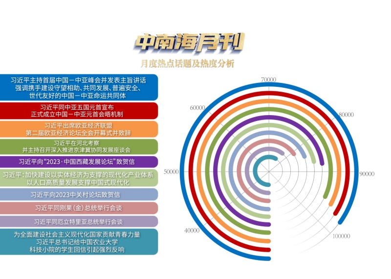 央視網(wǎng)“智聞”系統(tǒng)提取分析5月全網(wǎng)時政新聞熱點(diǎn)顯示,“習(xí)近平主持首屆中國—中亞峰會并發(fā)表主旨講話 強(qiáng)調(diào)攜手建設(shè)守望相助、共同發(fā)展、普遍安全、世代友好的中國—中亞命運(yùn)共同體”“習(xí)近平同中亞五國元首宣布正式成立中國—中亞元首會晤機(jī)制”“習(xí)近平出席歐亞經(jīng)濟(jì)聯(lián)盟第二屆歐亞經(jīng)濟(jì)論壇全會開幕式并致辭”等元首外交活動備受關(guān)注。